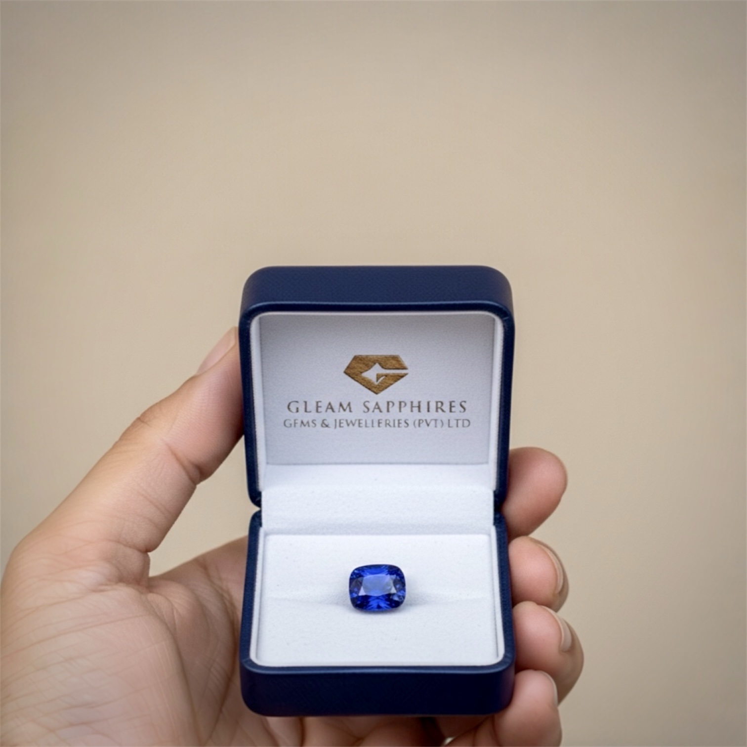 A stunning 10.30-carat natural blue sapphire from Sri Lanka, featuring a vibrant royal blue hue. Expertly cushion cut and eye-clean in clarity, this gem has undergone standard heat treatment to enhance its color and brilliance.