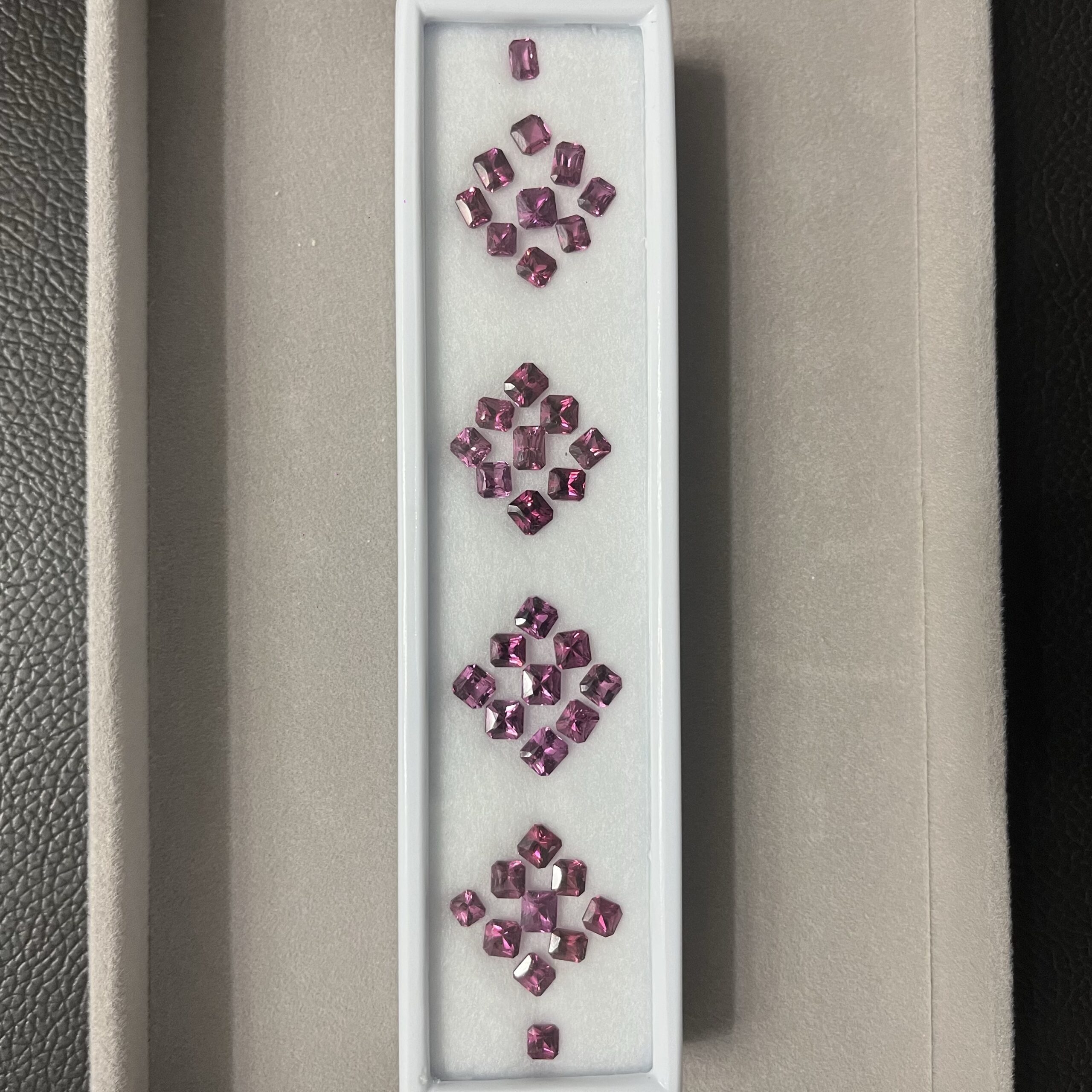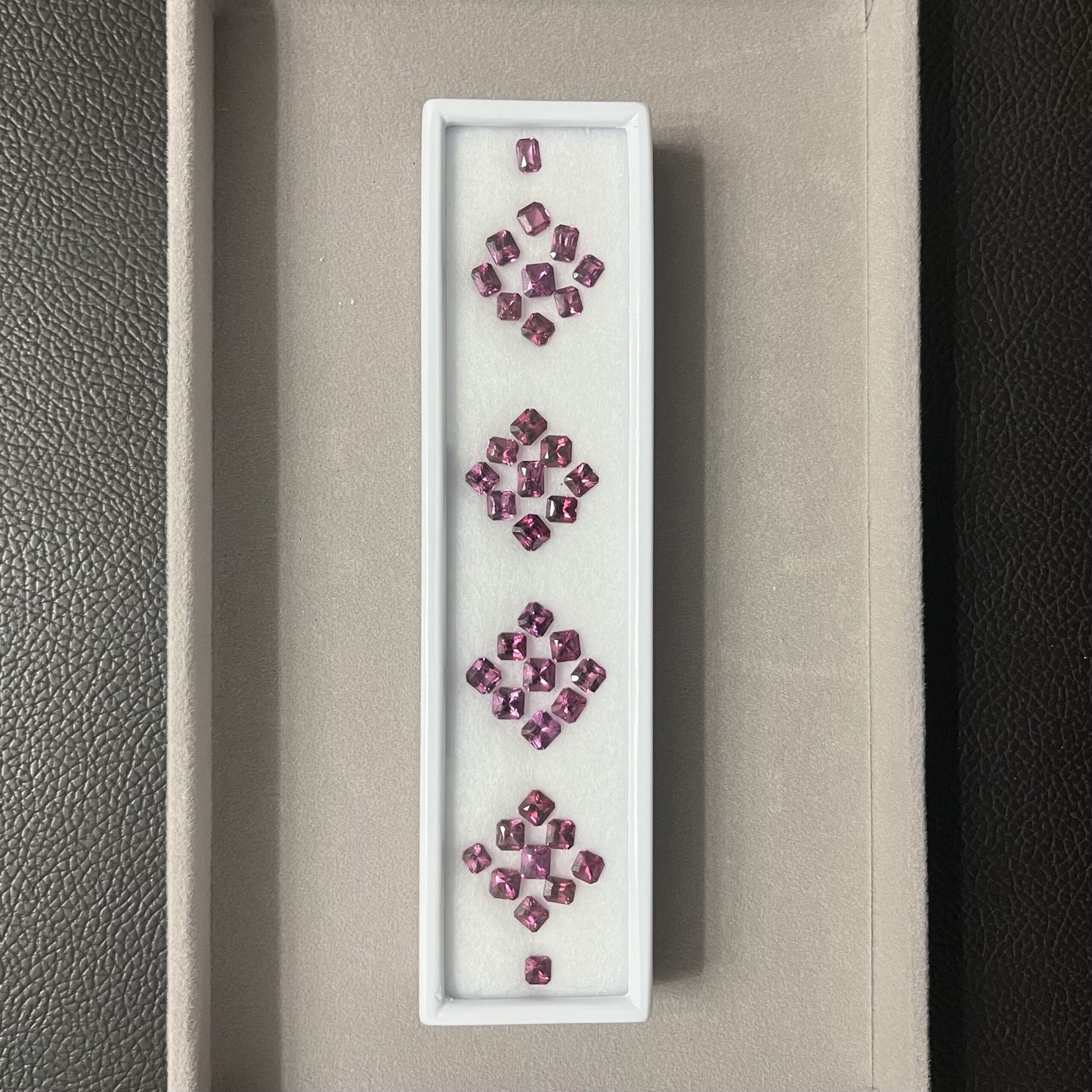This exquisite parcel of 38 garnets, totaling 31.59 carats, showcases a stunning collection of gemstones masterfully cut in the elegant Asscher shape. Known for its timeless appeal and distinctive step facets, the Asscher cut brings out a sophisticated sparkle and deep brilliance in each stone.